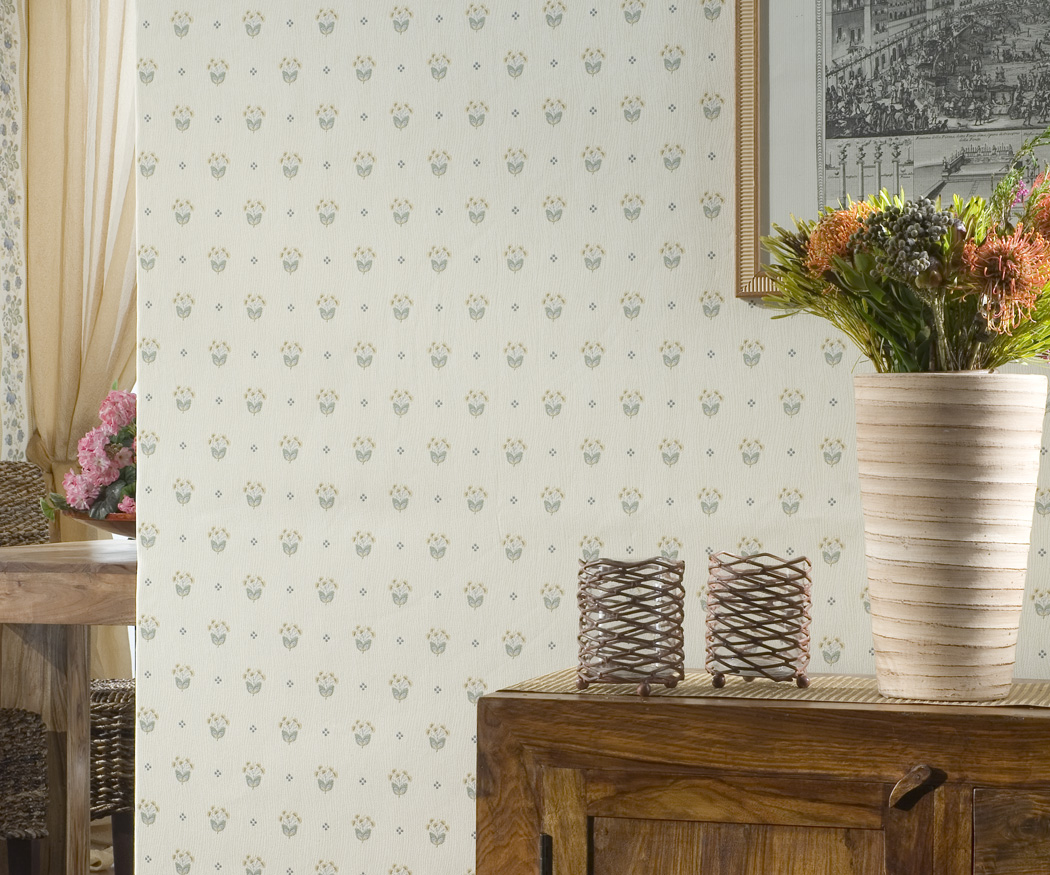 Garden — цветущий сад. Коллекция текстильных бесшовных настенных покрытий от Sangiorgio полная воздуха и красок. Легкие ветви лилий сочетаются с игривой волнистой полоской, украшенной цветами. Садовые решетки в прованском стиле прекрасно гармонируют с геометрическим рисунком в виде точек и отдельных цветков.